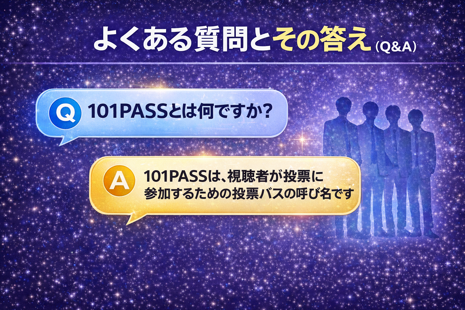 A: 「101PASS」とは、まず38人の候補練習生が公開され、その中から視聴者の投票によって最終的に101人の練習生を選抜する新制度です。視聴者が本格的なオーディション開始前から選考に参加できるのが特徴です。